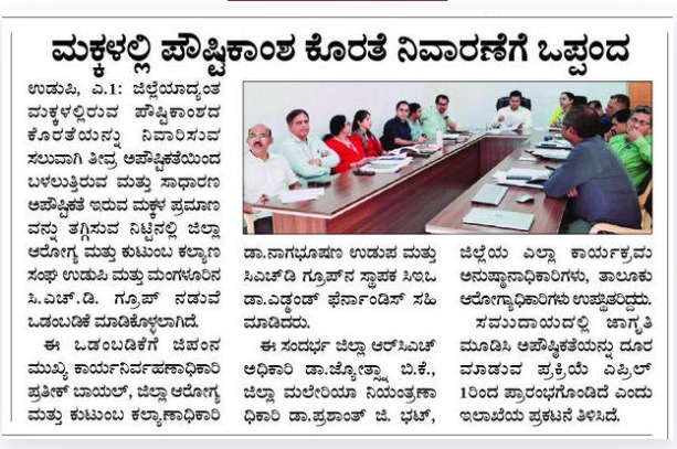 ಉಡುಪಿ, ಎ.1: ಜಿಲ್ಲೆಯಾದ್ಯಂತ ಮಕ್ಕಳಲ್ಲಿರುವ ಪೌಷ್ಟಿಕಾಂಶದ ಕೊರತೆಯನ್ನು ನಿವಾರಿಸುವ ಸಲುವಾಗಿ ತೀವ್ರ ಅಪೌಷ್ಟಿಕತೆಯಿಂದ ಬಳಲುತ್ತಿರುವ ಮತ್ತು ಸಾಧಾರಣ ಅಪೌಷ್ಟಿಕತೆ ಇರುವ ಮಕ್ಕಳ ಪ್ರಮಾಣ ವನ್ನು ತಗ್ಗಿಸುವ ನಿಟ್ಟಿನಲ್ಲಿ ಜಿಲ್ಲಾ ಆರೋಗ್ಯ ಮತ್ತು ಕುಟುಂಬ ಕಲ್ಯಾಣ ಸಂಘ ಉಡುಪಿ ಮತ್ತು ಮಂಗಳೂರಿನ ಸಿ.ಎಚ್.ಡಿ. ಗ್ರೂಪ್ ನಡುವೆ ಒಡಂಬಡಿಕೆ ಮಾಡಿಕೊಳ್ಳಲಾಗಿದೆ.